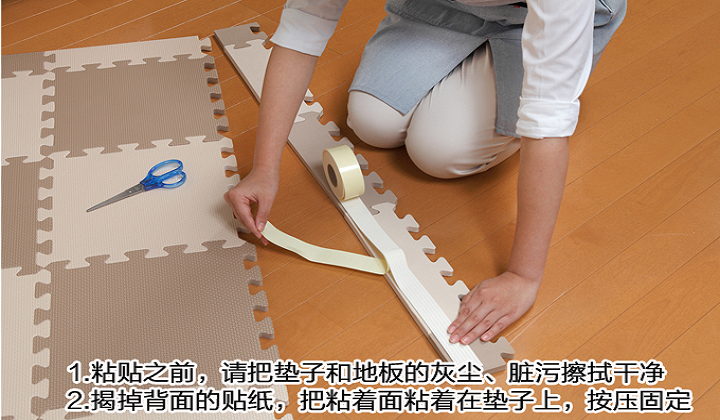 使用方式:解掉背面的貼紙,將粘著面粘在墊子上,按壓固定好即可。粘貼之前請將墊子和地面清洗干凈。